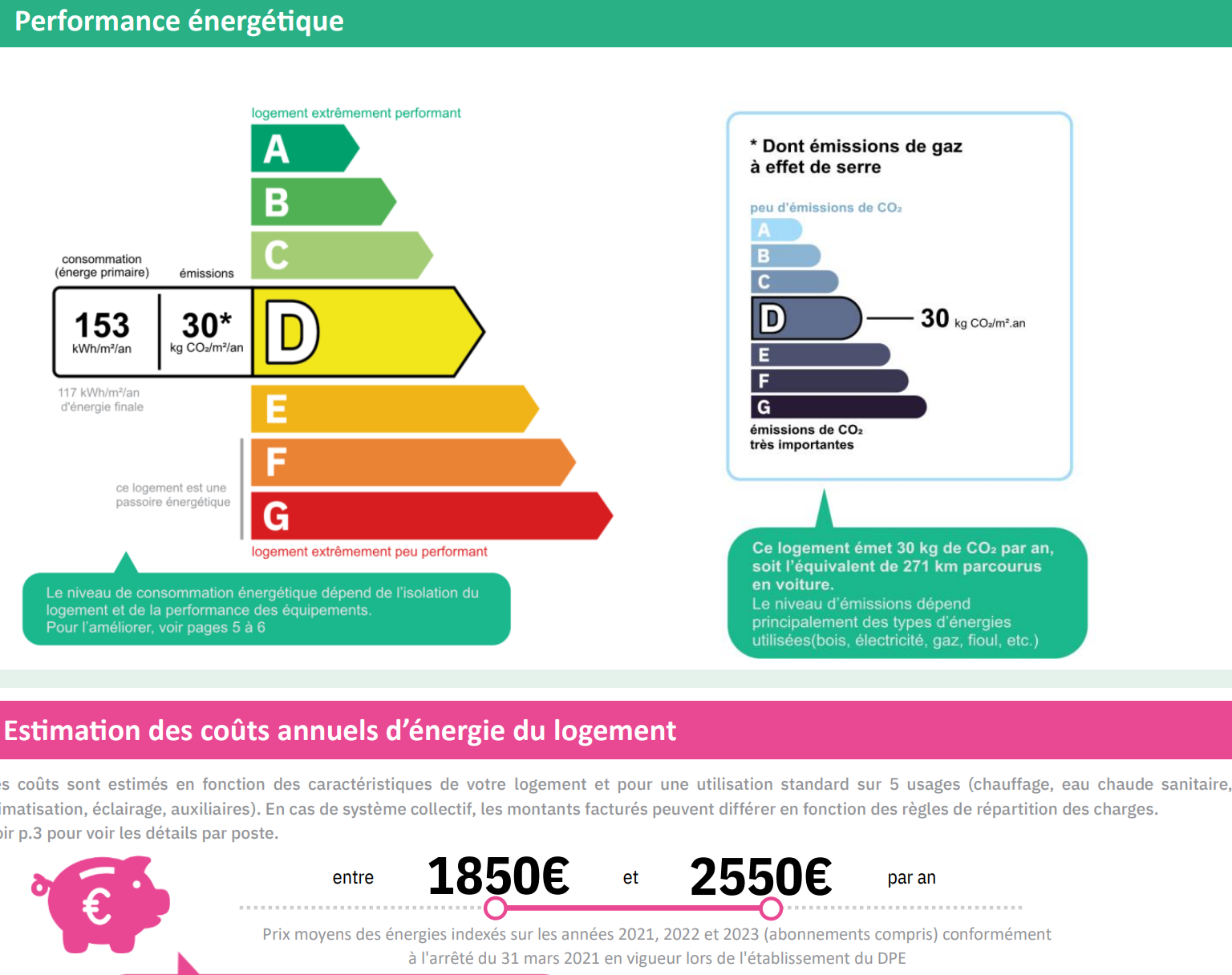 Estimation des coûts annuels d’énergie du logement : entre 1850 € et 2550 € par an pour un prix moyen des énergies indexés abonnements compris sur les années 2021, 2022 et 2023.