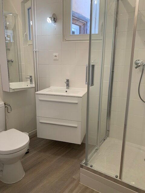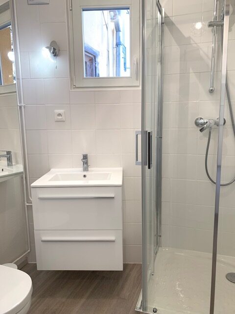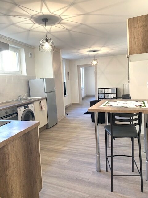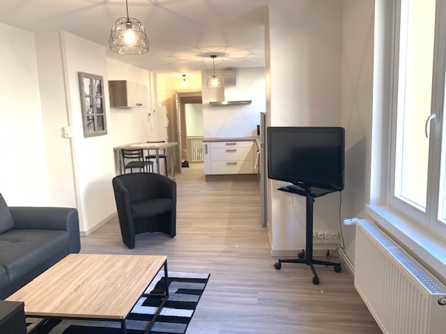Une entrée, une salle d’eau équipée, une cuisine équipée (mobiliers, plaque de cuisson, four, réfrigérateur/congélateur) ouvert sur salon, une chambre.