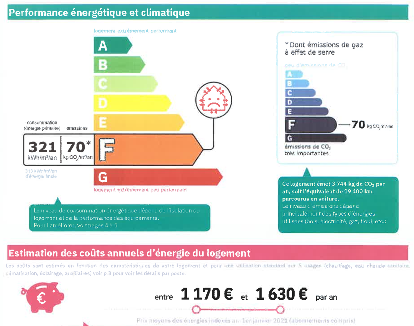 Logement à consommation énergétique excessive : Classe énergie F, Classe climat F Montant moyen estimé des dépenses annuelles d’énergie pour un usage standard, établi à partir des prix de l’énergie de l’année 2021 : entre 1182.00 et 1601.00 €. Les informations sur les risques auxquels ce bien est