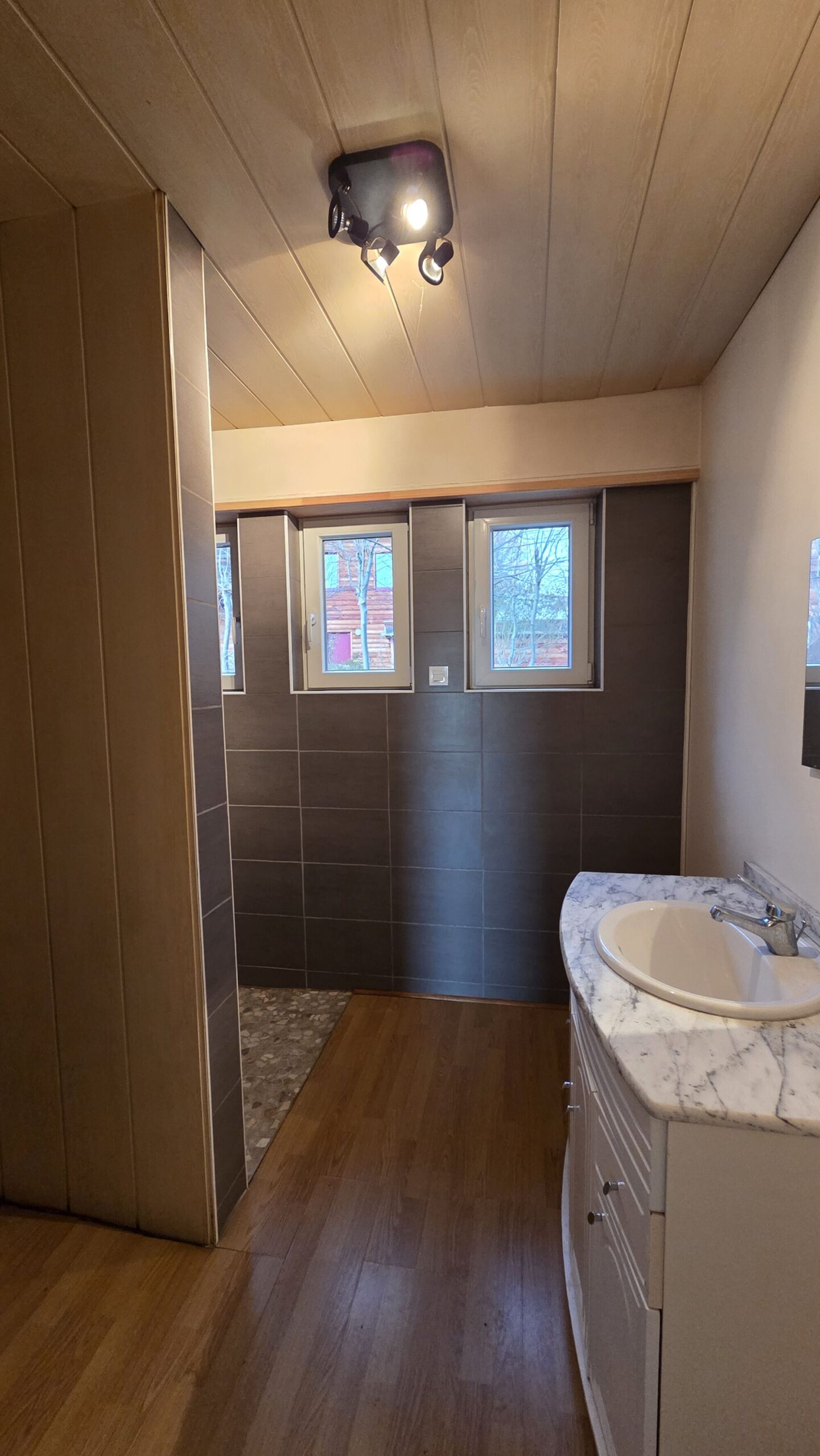 Au rez-de-chaussée: un couloir, une salle d’eau avec WC, une cuisine ouverte sur un espace de vie, deux chambres.
