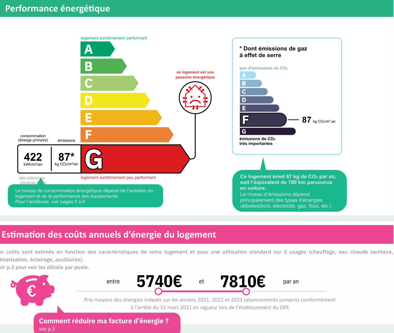 Estimation des coûts annuels d’énergie du logement pour un usage standard (chauffage, eau chaude sanitaire, éclairage, auxiliaires) : entre 5740 € et 7810 €
