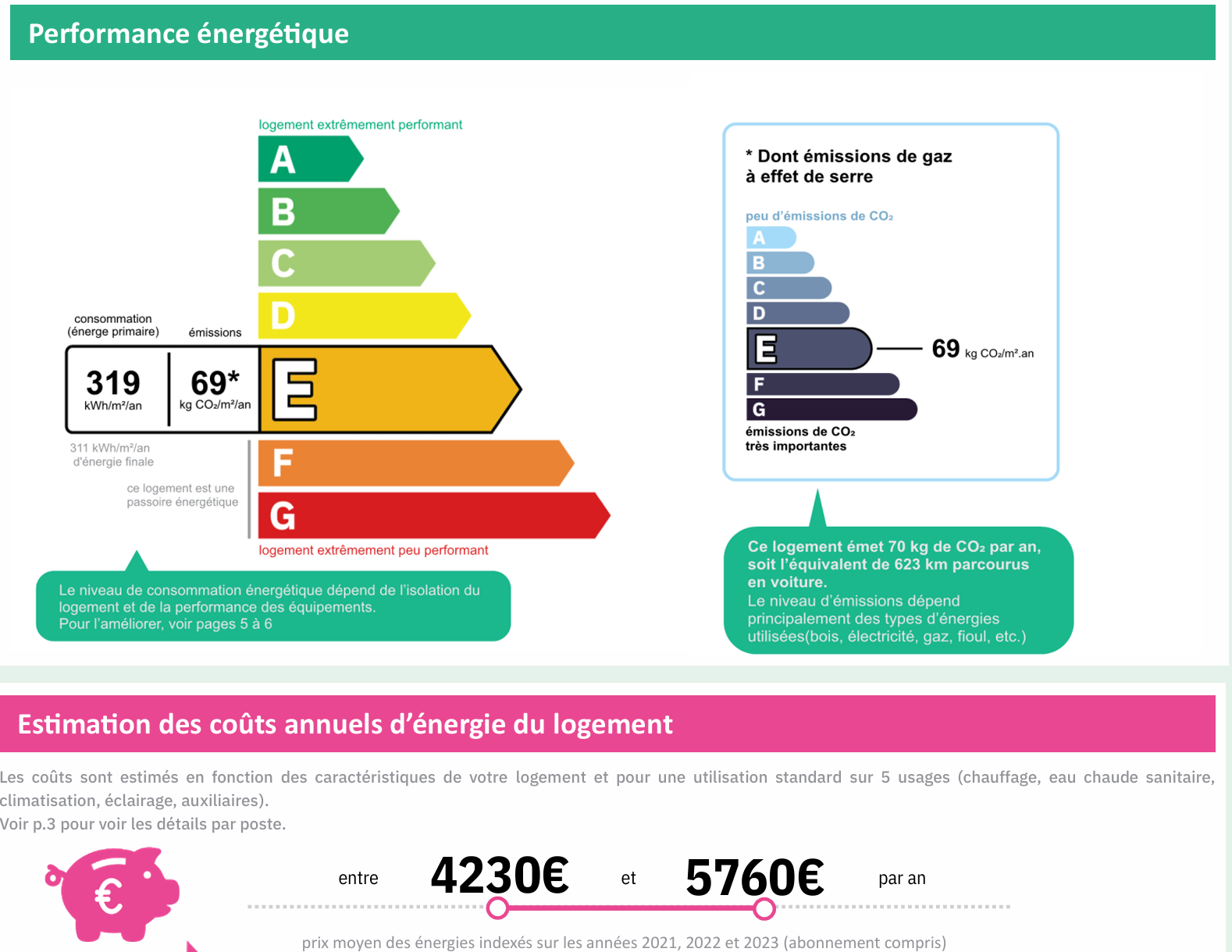 Estimation des coûts annuels d’énergie du logement pour un usage standard (chauffage, eau chaude sanitaire, éclairage, auxiliaires) : entre 4230 € et 5760 €