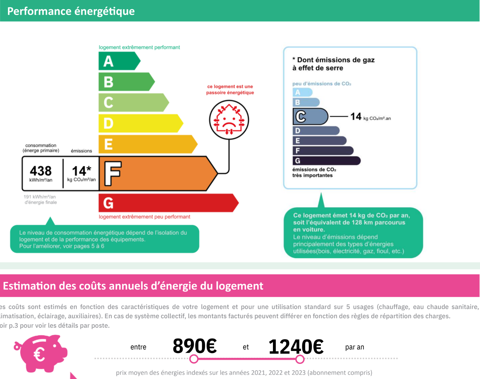 Estimation des coûts annuels d’énergie du logement : entre 890€ et 1240 € par an pour un prix moyen des énergies indexés au 22/08/2025 abonnements compris.